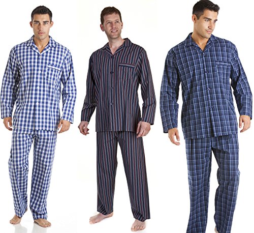 3 pack Of Mens Quality Lounge - Sleep Wear Pyjamas Made By Haigman. Printed Check/Striped Designs With Long Sleeves, Button Fronted Top and Elasticated Waistband Trouser With Button Fly. 100% Cotton