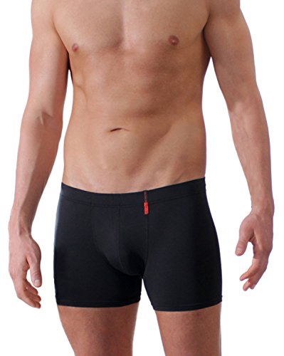 ALBERT KREUZ men's boxer shorts with straight leg border made of functional coolmax-cotton fabric, black colored These tight-fitting, breathable trunks are made of a high-tech functional fabric whose very high wearing comfort is characterised by its special ability to transfer humidity from the skin through the fabric fibres and diffuse it without leaving a moist sensation. The mixture of coolmax and cotton has a cooling effect in summer and gives a warming, cosy feeling in winter - almost like an "integrated air-condition". The brand label is vertically stitched on the interior waistband which keeps from cutting into the skin. There is no bothering center seam on the backside of the boxer shorts making them highly comfortable to wear. The underpants are ideal under business clothing and invisible under body-fitting trousers. Thanks to the special cut and the fabric's ability of sweat absorption and diffusion, it is particularly suitable also for any sports. Composition: 56% cotton 34% polyester (coolmax) 10% spandex Care instructions: care washing programme 40°C / 100° F no softener iron with low temperature, max. 100° C / 230° F tumble try (delicate) do not bleach